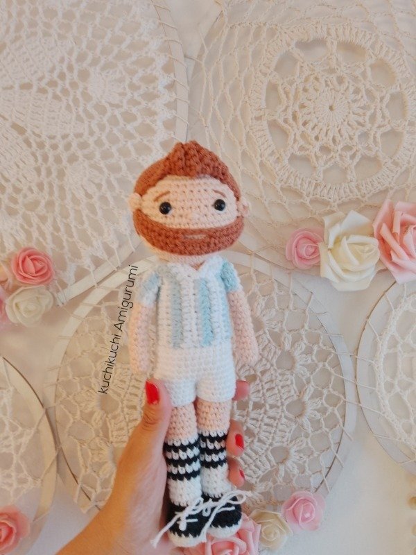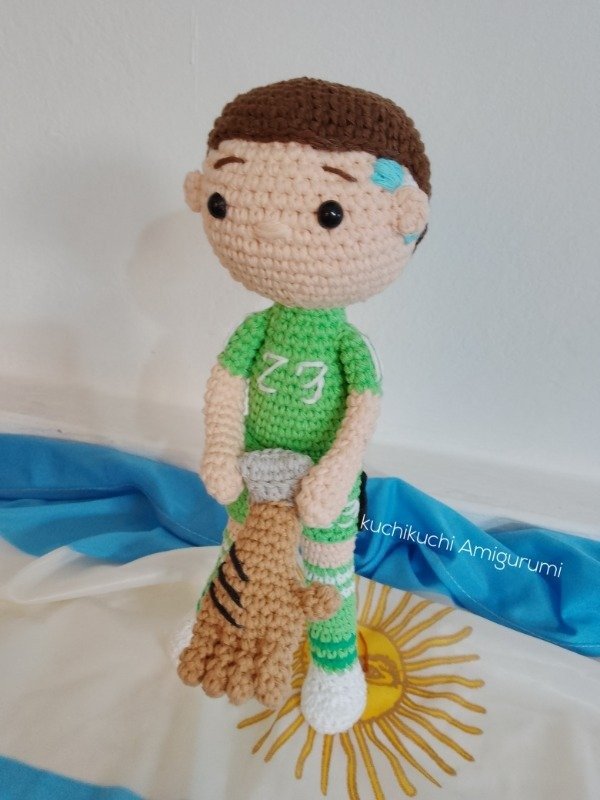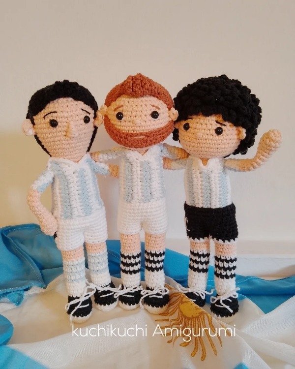 Cuatro íconos que hicieron historia, en versión amigurumi: Messi, Dibu Martínez ,Ángel Di María y Diego Maradona.
