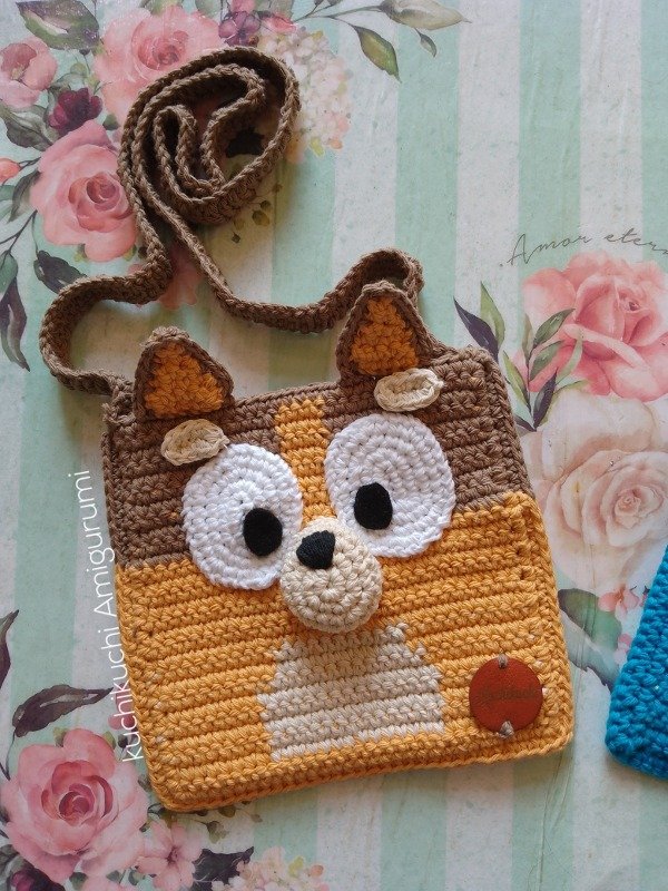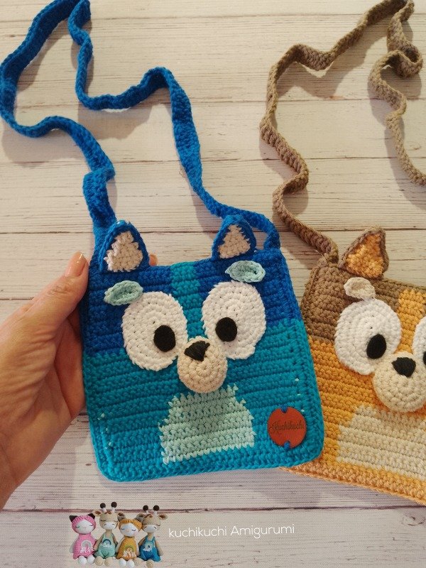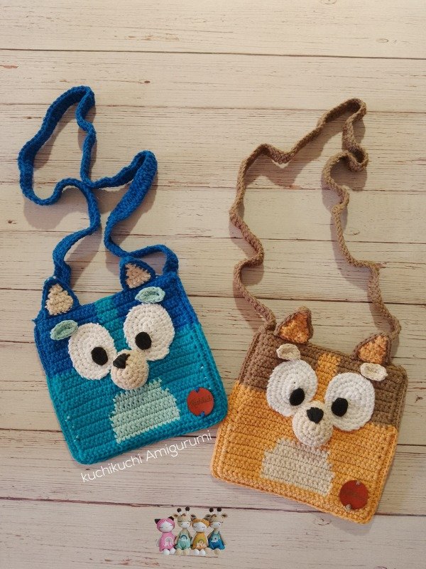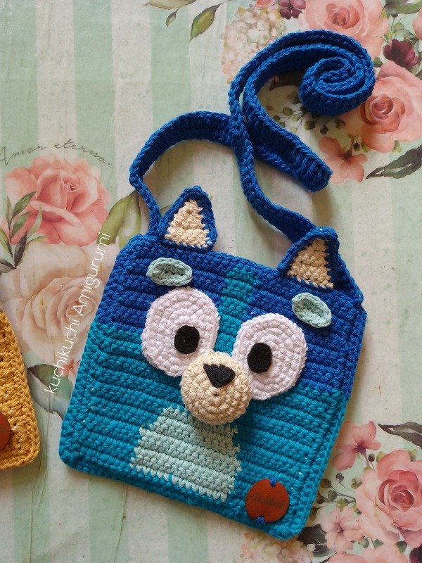Patrón tutorial de crochet para tejer los bolsitos de Bluey y Bingo. Con fotos del paso a paso y video de apoyo para los cambios de color, en este proyecto vas a necesitar hilo de algodón mediano 8/6 , aguja de crochet num 2.5 mm , vellón siliconado ( muy poquito) y pañolenci. Este es un """ TUTORIAL DE CROCHET, NO EL PRODUCTO TERMINADO """"