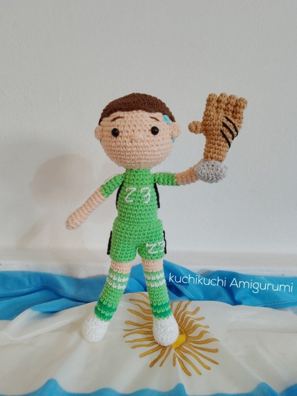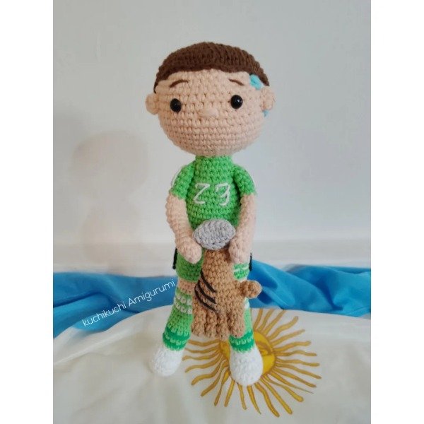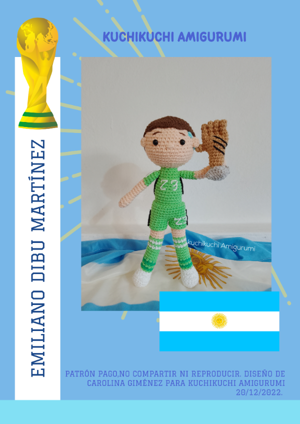 Un nuevo patrón kuchikuchi Amigurumi para tejer a Dibu Martínez, PDF digital, con fotos del paso a paso. Tejido en hilo de algodón 8/6 y con aguja de crochet num 2.5 mm. Su medida final es de 27 CM aprox esto puede variar dependiendo de tus materiales y tensión de tejido. Este no es el Amigurumi ya tejido sino un tutorial para tejedoras. Una vez realizada la compra y enviado el archivo NO se acepta devolución.