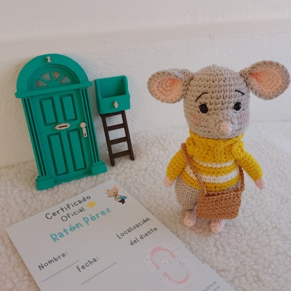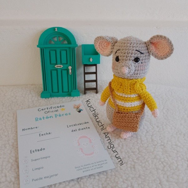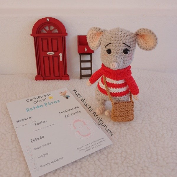 Patrón PDF para tejer a tu Ratón Pérez kuchikuchi, está realizado en hilo de algodón mediano, su medida final utilizando crochet num 2.5mm es de 17 cm . Incluye fotos del paso a paso y un archivo descargable del Certificado de Ratón Pérez 🥰